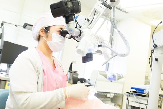 当院は患者さまの心身へ少しでも負担が少ない治療を心がけております。マイクロスコープを使用して精密な診断や治療を行ったり、ラバーダム防湿によって治療部位を唾液による感染から守ったりするのがその一例です。セラミックの治療ではCAD/CAMシステムを使用し、スピーディに終えられるよう努めています。